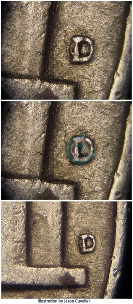 Something I else I should note with the diagnosis of varieties, is that with many times an attributer does their best to imagine scenarios where two metal objects, one an annealed (soft) die face, and the other being a tempered (or hard) object that makes impressions into the die. The object creating an impression most often would be a hub, old digit punches for dates or mintmark punches. Facets of the tempered object may not penetrate the die face equally. The object making an impression could be oriented any number of ways so that primary plane (or face) is not straight with the plane of the die. All factors that cannot be fully accounted for in an overlay, if accounted for at all visually.